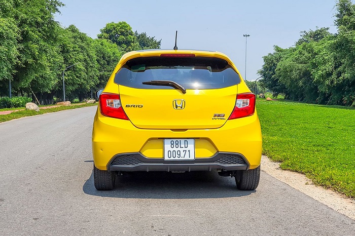 Đuôi xe của Honda Brio 2021 có cánh hướng gió, đèn báo phanh trên cao. Không chỉ vậy, Brio còn có cả ăng ten dạng cột, đèn hậu góc cạnh vuốt dài về hông xe. Tất nhiên, không thể không nhắc đến nắp cửa sau của Brio nhỏ gọn và thiết kế ống xả đặc biệt nhất trong phân khúc.