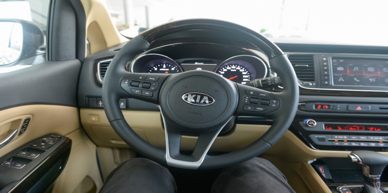 Kia Sedona đem đến cho tài xế vô-lăng ba chấu bọc da có khả năng sưởi hiện đại. Không những thế, chắc hẳn những người yêu thích thiết kế có một chút phong cách của gỗ sẽ hài lòng khi vô-lăng điểm thêm chi tiết ốp gỗ sang trọng.